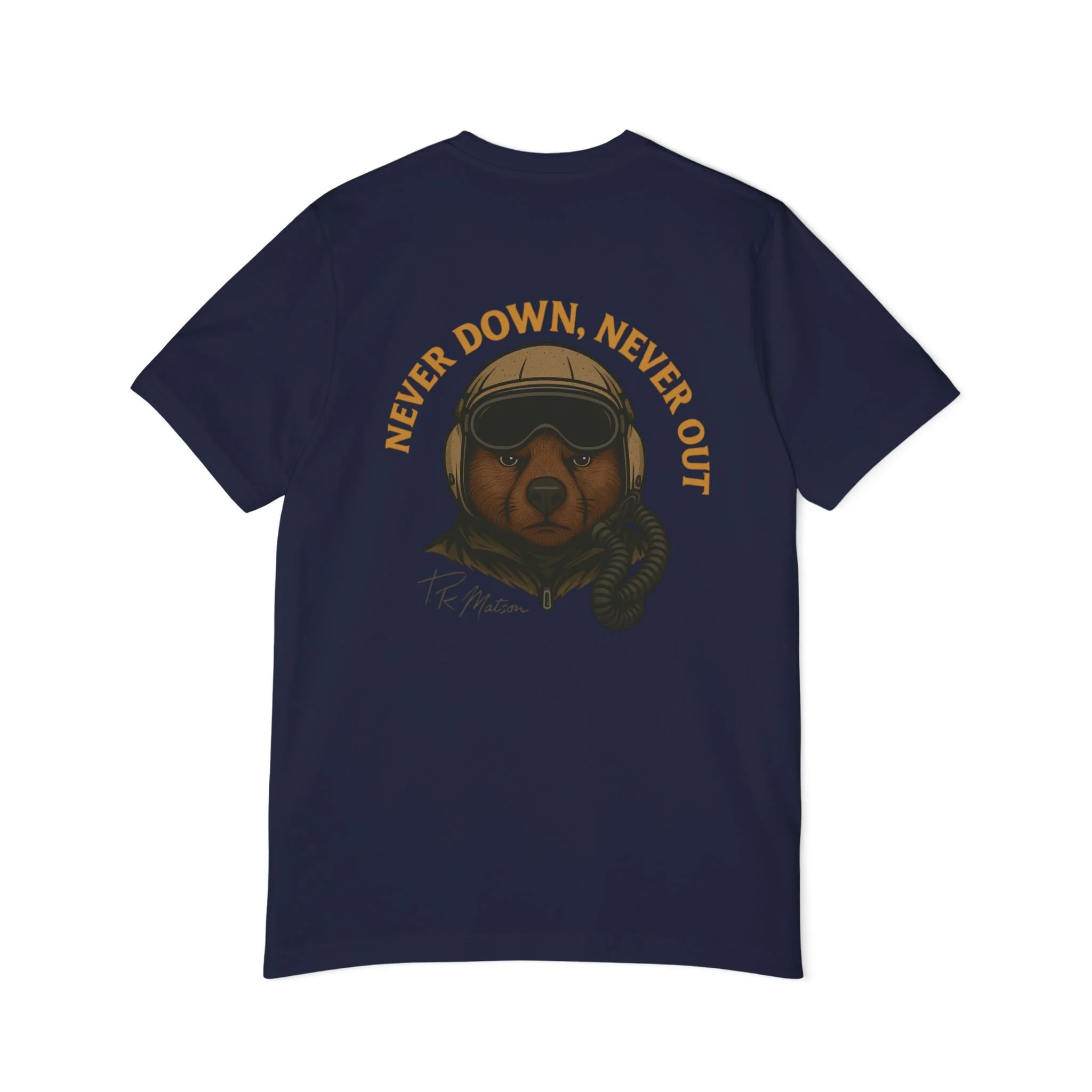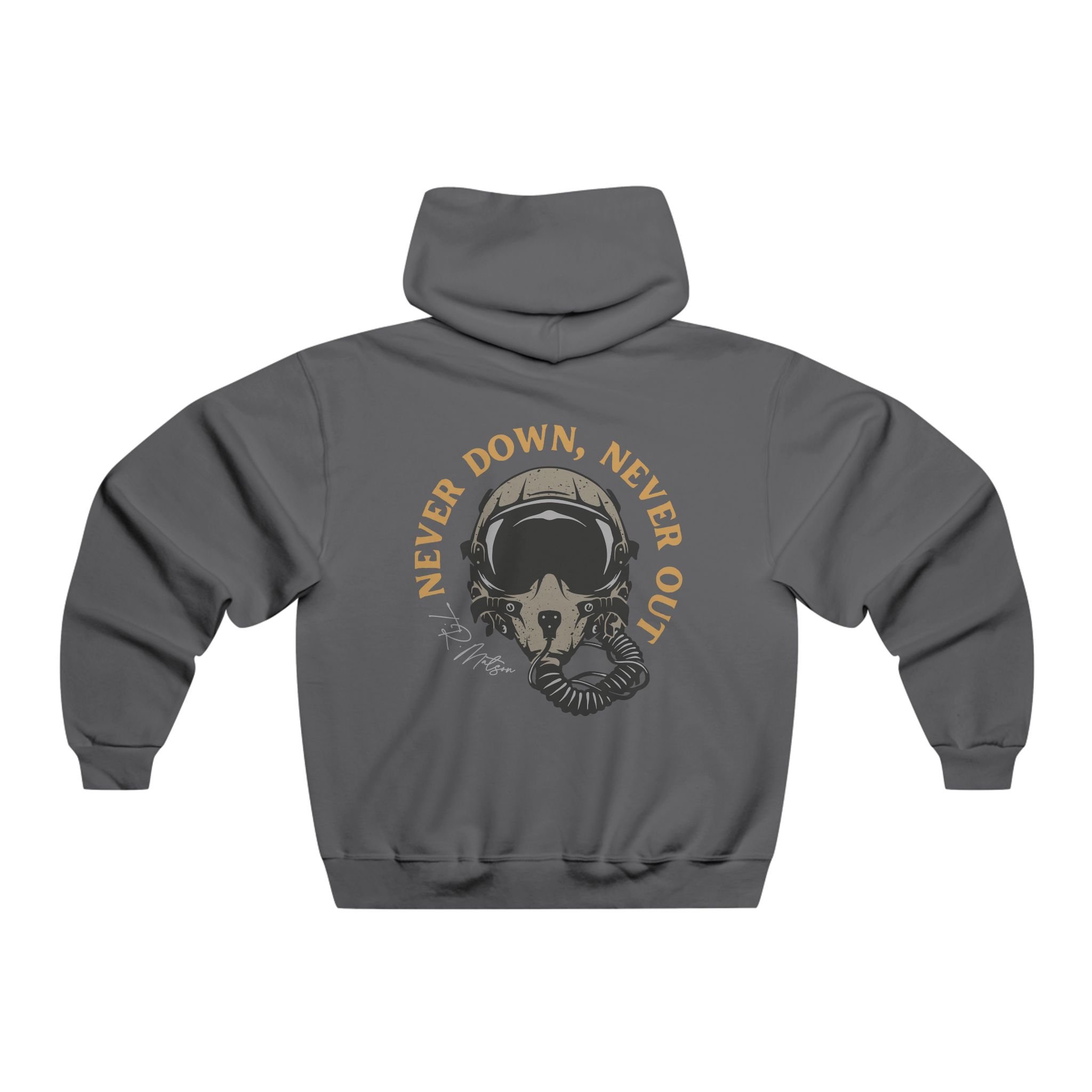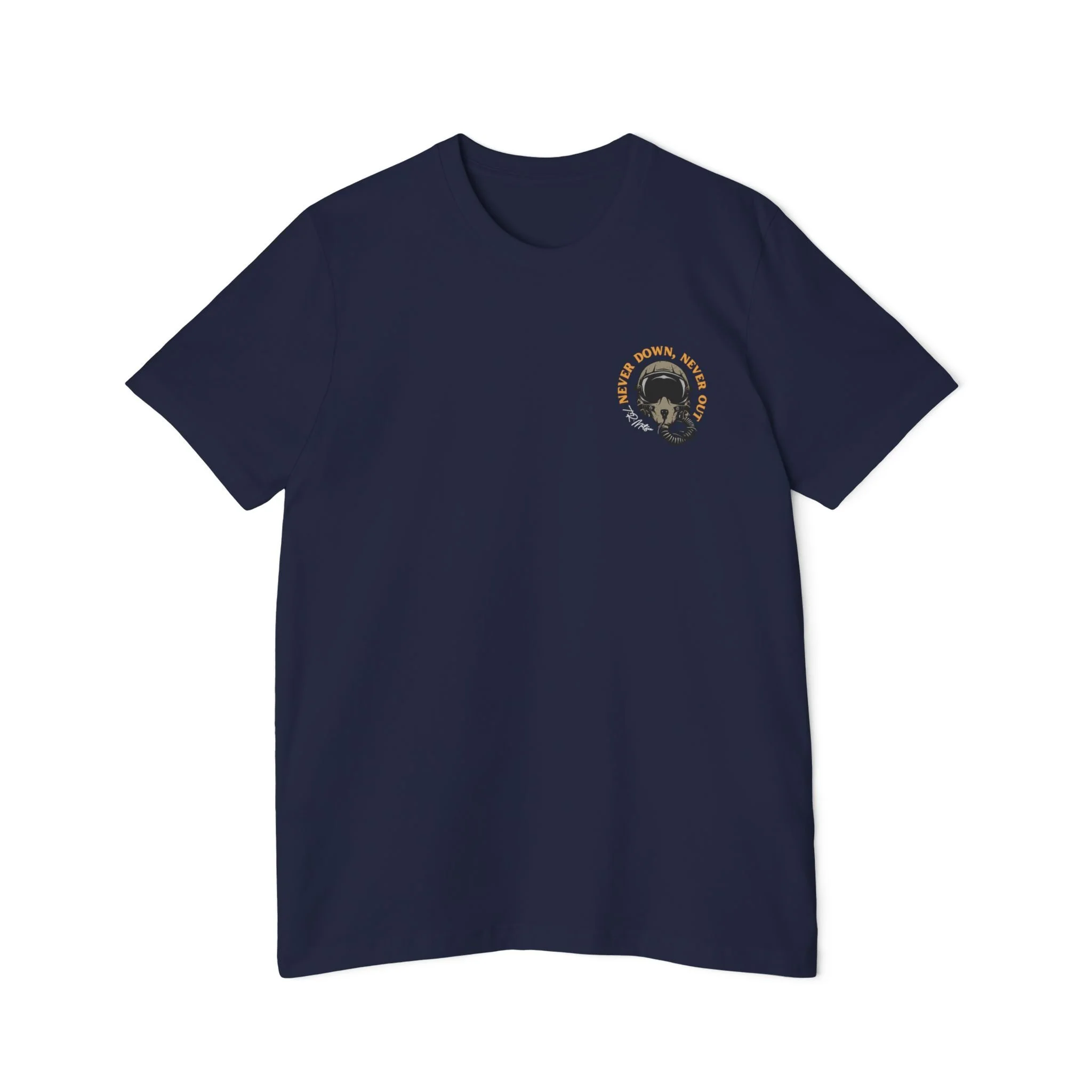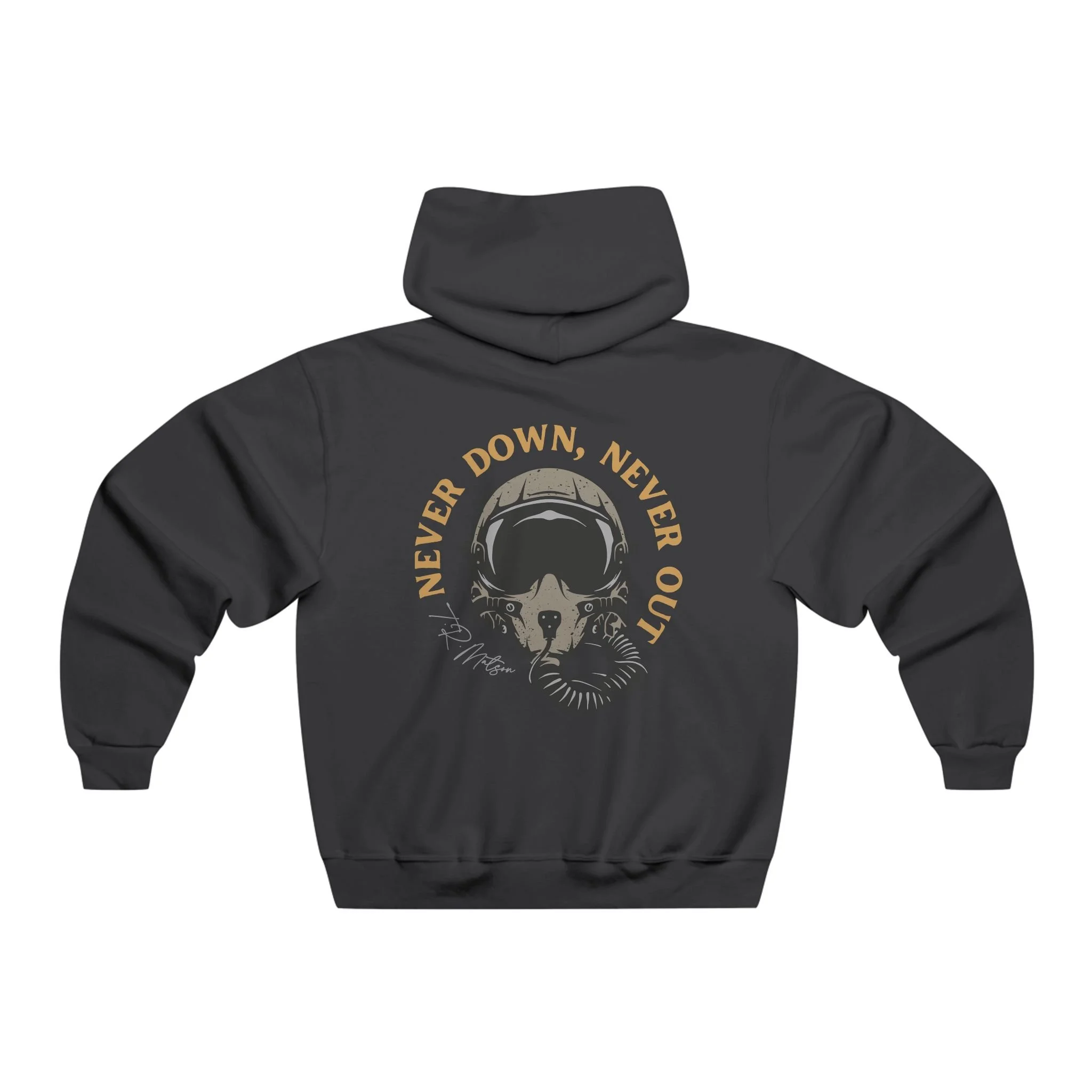 Featuring T.R. Matson's signature, self motivating phrase, "Never Down, Never Out."
